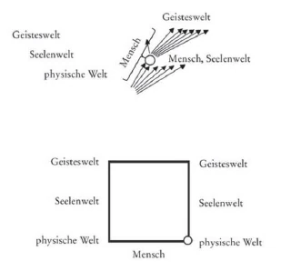 In der Geisteswelt ist der Mensch im Mittelpunkt einer strahlenden Welt, die von allen Seiten in ihn einstrahlt, einer tönenden Welt, die in ihren Schwingungen in ihm zusammenströmt. Das wird dargestellt durch den Kreis, wo der Mensch in der Mitte steht.