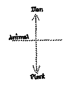 In surveying the whole evolution: plant, animal, man, one discovers definite relationships between them. The plant is reversed in man. The direction of the animal lies midway between them. The plant has sunk its roots into the earth and directs its sexual organs upward towards the sun. If we turn the plant halfway round we have the animal. If we turn it right round we have man. That is the original significance of the cross;11This is described in more detail in a lecture 22.11.1907. ‘The plant is drawn with its direction vertically towards the earth, the human being also vertically directed away from the earth, the animal horizontal.’ St. John, Notes on 8 lectures. Lecture 7. (Typescript). plant kingdom, animal kingdom, human kingdom. The plant sinks its roots into the earth. The animal is the half-reversed plant. Man is the completely reversed plant. This is why Plato says: ‘The World Soul is stretched on the Cross of the World Body.’12Plato, Timaeus Chapter 8.