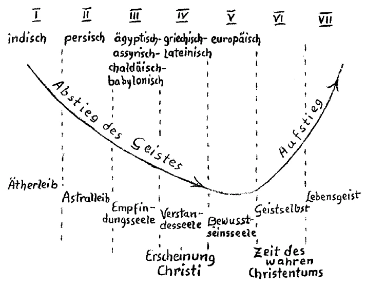 [ 8 ] Wir können den Gang der Menschheitsgeschichte in der nachatlantischen Zeit durch nebenstehende Kurve darstellen.