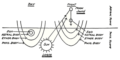 The above drawing attempts in a symbolic manner to show the waking-day human being when his physical and etheric bodies are dependent upon the Divine and his ego and astral body are within the physical and ether bodies upon the physical plane. Here the whole human organism is shone upon by the sun from without. We now know that for the humanity of primeval ages, night was much longer and much more filled with activity than it is at present. The astral body and ego were then outside of the physical and ether bodies, the ego existing wholly within the astral world, and the astral body sinking into the physical body from without, having, however, its entire inner being still embedded in the divine-spiritual world. Therefore, the sun could not shine directly upon the human astral body and enkindle in it the force of love. Hence, the moon, which reflects the sunlight, was active through Jahve or Jehova. The moon is the symbol of Jahve or Jehova and the sun is none other than the symbol for the Logos, which is the sum of the other six Elohim. This drawing, which you should study, and upon which you should meditate, tries to indicate this in a symbolic way and if you reflect upon it, you will discern what deep, mystery-truths are presented in it, namely: that during long periods of time, in sleep-consciousness, the force of love was being implanted in human beings by Jehova, in a manner of which they were themselves unconscious. In this way they were being made capable of experiencing the Logos, of feeling the force of Its love. One can ask:—How was this possible, how could that take place? We come now to the other side of the mystery.