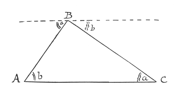 It will now be a case of starting out from some conception with which you are acquainted, a conception that bears some likeness to the inner life of the Folk-spirits. A man has not many such in his normal life, on the contrary, he has in his own consciousness extremely little of that which lives in the consciousness of the Folk-spirits. You may nevertheless form an idea of it if you will patiently follow with me the following considerations. You have all learnt at school that the three angles of a triangle are 180 deg., and you know that you could never learn that by any sort of external experience. I want you just to think of an iron or a wooden triangle; if now you measure with an instrument what the three angles together amount to, this external experience can never inform you that these three angles make 180 deg., but you will at once be informed, whether you draw these three angles or only imagine them, if you experience from within, that the three angles are 180 deg. You must realize it through the power of your own mind, from within. You need only carry out the following in thought. What I am now drawing is only drawn to represent the thought. In this figure you have strict proof that the three angles together make 180 deg.