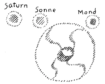 If I may use a crude comparison, you can imagine this secondary stream as the relationship between the air, the atmosphere surrounding the Earth, as a finer substance, and the denser parts of the Earth, the water and the solid Earth. We could also imagine that a denser development passes over Saturn, the Sun, and the Moon, but that this denser development is always enveloped by a thinner development. We could imagine, as it were, that the old Saturn, the old Sun, and the old Moon have their divine-spiritual essences acting directly upon themselves in their own substance, but that there are always other divine-spiritual essences in the surrounding area which, in turn, surround the spiritual essences acting directly in Saturn, the Sun, and the Moon, just as the air surrounds the Earth. We have thus indicated two realms of gods or spirits, one of which participates directly in everything that happens successively on Saturn, the Sun, and the Moon, entering into everything; the other generation of gods, the other series of gods, keeps itself somewhat aloof, as it were, intervening only from outside, indirectly, and we must now form a conception of how one kind of god relates to the other kind of god. And I ask you now to pay close attention to the relationship between the gods who are actually more comprehensive, who participate directly in the development of Saturn, the Sun, and the Moon, and the other gods who, as it were, hover around these spheres in their succession.