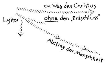 Wenn wir uns ein graphisches Bild von dem machen wollen, was in der alten lemurischen Zeit für die Erdentwickelung des Menschen geschehen ist, so können wir sagen: Der Mensch ist dazumal heruntergestiegen von göttlichen Höhen; es war ihm bestimmt in einer gewissen Weise sich weiter zu entwickeln; aber durch den luziferischen Einfluß wurde der Mensch tiefer in die Materie hineingeworfen, als es ohne denselben der Fall gewesen wäre. Dadurch wurde sein Fortgang in der Entwickelung nun ein anderer.