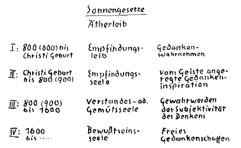 Wenn Sie das hier verfolgen, so ist es allerdings der Teil, den ich nicht in meinem Buche darstellen konnte für die Außenwelt; aber es liegt darinnen. Und wenn Sie die Beschreibungen lesen, die von den einzelnen Epochen gegeben werden, so werden Sie, wenn Sie ordentliche Anthroposophen sind, sehr klar auf das hingewiesen werden, was ich hier links (siehe Schema) angeschrieben habe. Es entwickelt sich alles etwa so, wie sich der Mensch selber entwickelt: vom Ätherleib zum Empfindungsleibe, zur Empfindungsseele, zur Verstandesseele, zur Bewußtseinsseele. Wir verfolgen einen Gang, wie den Gang der Menschheitsentwickelung, aber anders geordnet. Es ist nicht der Gang der Menschheitsentwickelung, es ist etwas anderes. Wesen entwickeln sich, und die benützen die menschlichen Kräfte in der Empfindungsseele, in der Verstandesseele und so weiter. Durch den Menschen und sein Arbeiten gehen andere Wesen hindurch mit anderen Gesetzen, als die Gesetze des Menschenwerdens sind.