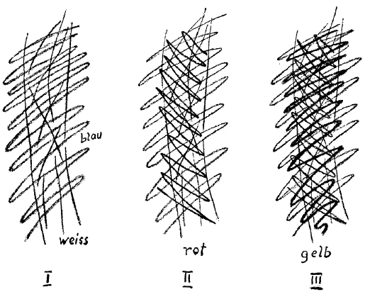 [ 3 ] If I were to draw a diagram (see drawing): Imagine that humans consist of these substances, which are more or less solid, bone substances and so on, so you imagine humans as a kind of constructed framework (white). The other thing that is actually liquid in humans, as I have shown in the example of cerebral fluid, which is air-like, is not considered part of the human organism in anatomy and physiology. One says: Yes, humans breathe in air, it travels through them in certain ways, it also has certain tasks. It is exhaled again. We speak of the heat state of humans, but basically we only consider the solid as the organizing factor, and we do not see that, apart from having this solid framework, the whole human being can also be seen as a fluid, let us say, initially as a column of fluid (see drawing, blue, T) that the entire human being is permeated with air (red, II) and that he has a certain state of heat throughout (yellow, III). But on closer inspection, it becomes clear that just as the solid or solid-liquid must be regarded as a part, as a member of the human organization, so too must that which the human being has within himself as a direct fluid not as an indifferent liquid mass, but as being in a state of organization, albeit fluctuating, but nevertheless in a state of organization, and that this organization, the liquid, means just as much as the organization of the solid.