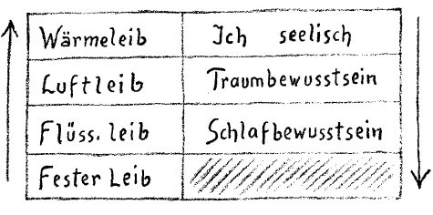 [ 28 ] And now, starting from school psychology, one asks: How does this soul-spiritual live in the physical? — Yes, you see, that is actually what one does. Consider: one has the solid body, the fluid body, the air body, the heat body. Through the heat body, the I develops ordinary clear daytime consciousness. But if you go down, you enter dream consciousness; further down, you enter dreamless sleep consciousness. Down there (hatched), as you know from “An Outline of Secret Science,” there is another state of consciousness that we do not need to consider now. If we now ask about the relationship between what is on the right and what is on the left, we see that they fit together, because there (left arrow) we move from below to above into the soul, into the body here (right arrow); the right and the left fit together. But in the external view today, we actually only perceive the solid body and, in turn, only this state of consciousness (I). Yes, the I hangs in the air, and the solid body stands on the ground; there is no relationship between them. And if you read today's teachings on the soul, you will see that the most incredible hypotheses are put forward about how the soul acts on the body. But this only stems from the fact that one looks at one part of the body and then at something completely separate from it, at a part of the soul.