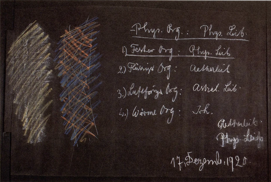 And now we come to the warmth-organism. It is of course quite in keeping with materialistic-mechanistic thought to study only the solid organism and to ignore the fluid organism, the aeriform organism, and the warmth-organism. But no real knowledge of man's being can be acquired unless we are willing to acknowledge this membering into a warmth-organism, an aeriform organism, a fluid organism, and an earth organism (solid).