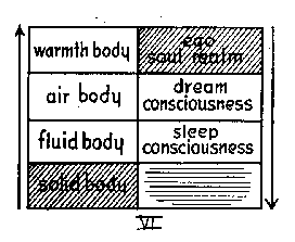 We have also a third state of consciousness, the dark consciousness of dreamless sleep, in which ideas and thought-pictures become not only hazy but dulled to the degree of inner darkness; in dreamless sleep we cease altogether to experience consciousness itself, just as under certain circumstances, while we are asleep, we cease to experience the aeriform body. (Diagram V)