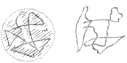 [ 8 ] Schauen wir einen anderen an, der nicht hellseherisch begabt ist, sondern der denken kann, von dem Roten da ist nichts vorhanden bei ihm, das bringt er nicht heraus; er bringt auch aus der geistigen Welt dieses Gedankengerippe (siehe Zeichnung links) nicht heraus; aber er strengt seine Denkorgane an und bringt dann durch seine Denkorgane dieses Gedankengerippe zur Welt (siehe Zeichnung rechts).