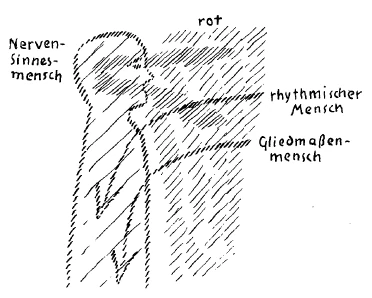 What is really going on in the human being? If you consider the human being as such—I shall draw an outline of him here—and turn to the structure of his brain, you find that first of all man is, as we know, a threefold being: the limb being, the rhythmic man, and the being of nerves and senses. When we now look at the latter, we have before us the most perfect part of the human being, in a sense, the most human part. In it, the external world mirrors itself (see drawing, red). I shall indicate this reflection process by the example of the perception through the eyes. I could just as well sketch the perceptions coming through the ear, and so on. The external world, therefore, reflects itself in the human being in such a way that we have here the structure of man and in him the reflection of the outer world.