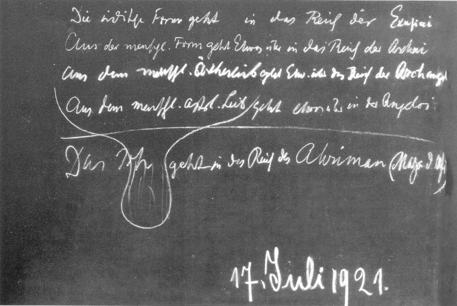 So what is actually there in the physical form ceases to be visible to the outer eye when the person has passed through the gate of death. The corpse has only had this form, and it still retains it. It loses it little by little, it is no longer its own. Just as if you – if I may use a rough comparison – have a pot shape and put it over the dough of the cake: the cake then also has the shape, but it is not part of the pot shape, and you cannot say that the cake you then have has this shape from its own material; no, it has received it from the pot that was put over it. And just as the cake retains the shape of the pan when you remove the pan, so the corpse retains the shape of the human being when that shape is removed. But this form itself, which is actually the form with which we walk around, ceases when the human being passes through the gate of death. However, the fact that we have this form, that this form can develop out of the laws of the world, just as a crystal develops out of the laws of the world, is inherent in the laws of the world. So we may ask ourselves: What becomes of this form? And here spiritual scientific research gives us the answer: That which is spirit continues to nourish and sustain itself from the Hierarchy, which we call the Archai, the Primordial Foundations. So we can say: Something passes from the human form into the realm of the Archai.