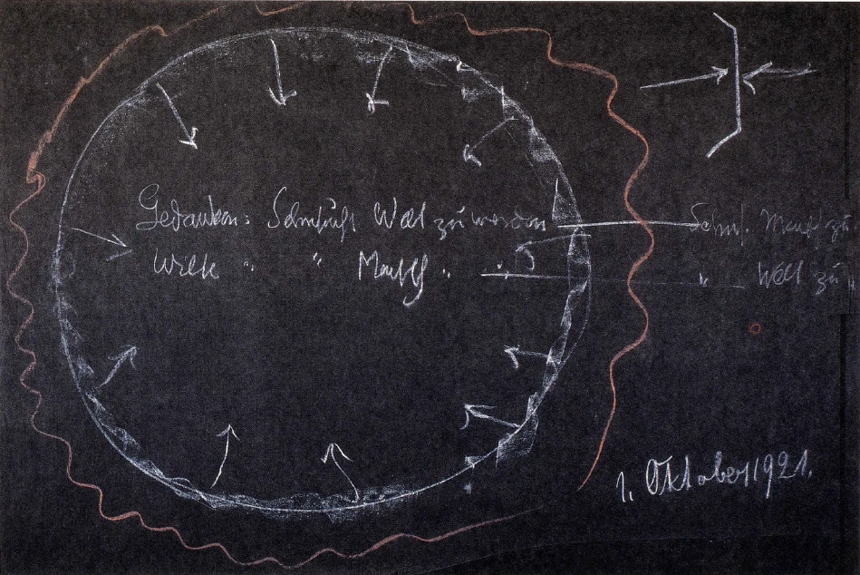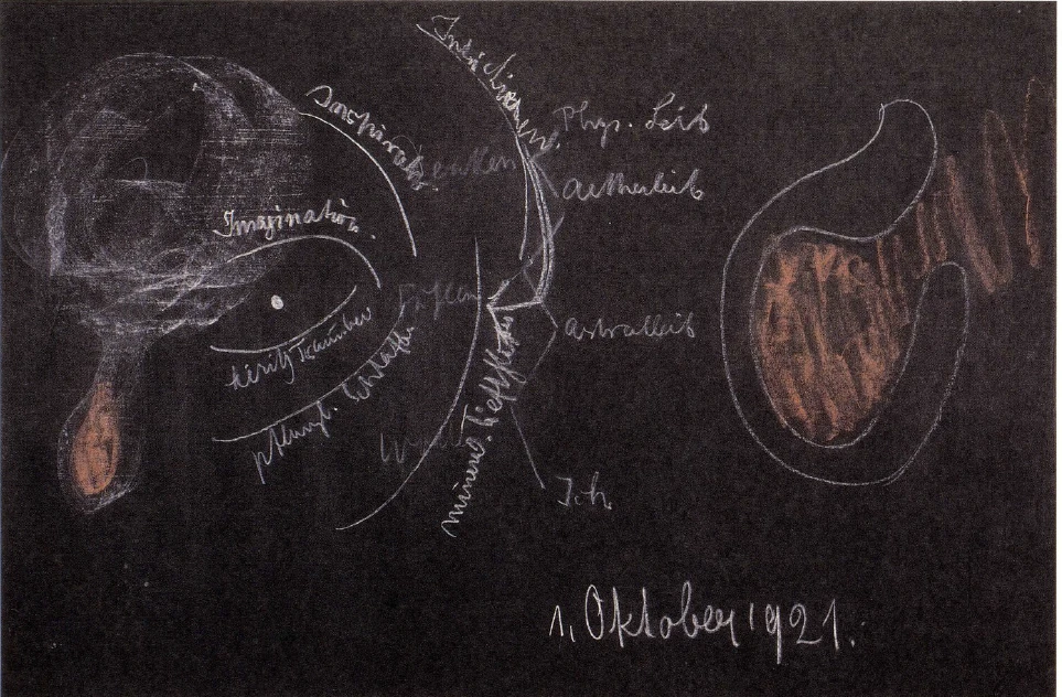 Our thought world, on the other hand, that world which can be seen in our memories, for example, which is reflected from us ourselves into our consciousness, bears within it the opposite longing. It has indeed formed a relationship with our human nature. Our thoughts have a strong relationship to our human nature. They then bear in themselves, when they go through death, the most intense longing to spread out into the world—to become world (see 1st diagram this lecture).