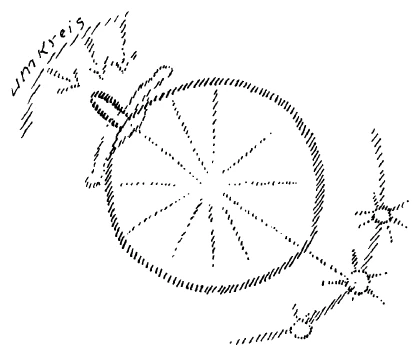 [ 36 ] One would therefore actually have to say: when drawing a human being, one would have to draw its head. But then you have a complete human being. You can see that you have a complete human being from the fact that if you take the lower jaw, it is actually legs, only they are directed backwards towards the head; this human being is sitting with his legs. The head is a complete human being, only the legs are turned upside down; they are the lower jaws here. The human being sits on them, so that I could draw it in such a way that I would actually draw a complete human being, albeit sitting, here.