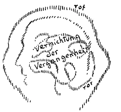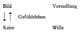 [ 21 ] But this causes the opposite process to take place, as after the end of the head. After the end of the head, the past is destroyed and matter is pulverized. After the end of the limbs, humans develop in such a way that they do not allow matter to reach full cosmic maturity. It remains behind. They hold it back. It is only because we do not allow our limbs to grow out that we have fingers and toes. If we allowed them to grow out, they would not only be covered with nails, but they would be completely stiffened and calloused. We therefore hold them back at an earlier stage. By holding back our limbs in this way, we are able to develop the will within them, which then becomes the basis for subsequent earthly lives. If we allowed humans to mature as limb beings, then life would end with our one earthly life. We preserve what passes into the future by not allowing our limb beings to mature fully. So here the opposite is the case: while, after the end of thought, the soul life becomes a picture life, in fact, if I may express it crudely, after the end of the limbs, life remains fleshly, materially, organically young, I would say. It does not grow old, it does not become calloused, it remains young. Because it remains young, the material can then fall away, and the image of the young passes through death into the following earthly life. There, the will can then develop. There is the end of the will. So we can say: The end of the human will is organic formation that has not come to an end. - If we can speak of “image” here (at the head), we must speak of something else there (at the foot). What is an organic formation that has not come to an end? A germ. For the germ can continue to develop. here (at the head) of the image, we must speak of something else. What is an unfinished organic formation? A germ. For the germ can develop further. While at the head we have something like an oyster shell, something that has separated as matter and is pure matter, after the end of the limbs we have something like germs. Here (above) we can say: We experience the pure etheric, the image, in our soul. Here (below) we do not experience the image, but we experience germinating life. (See illustration on page 112.) Here we experience a connection above with matter. That is why we can also move our limbs, because we are connected with matter. At the head, the human being cannot move much, at most insofar as his senses are transformed into limbs, and the human being is also a limb at the head.