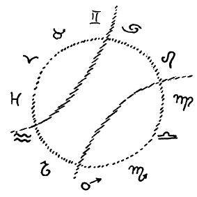 Here, then, human beings tear themselves away from the line of the zodiac in a different way, entering into the “human vertical” in the opposite direction. They remain fully exposed to the constellations of the zodiac with regard to form and to the outer planets with regard to the head, but withdraw from both influences by standing on the earth and letting the earth cover up the other side. Saturn and Jupiter influence human beings by letting their light shine on the earth. Living in images in their heads, human beings also receive the images of those starry worlds, just as they receive images of the planetary movements by developing the principle of life towards the head end. Images from the cosmos, the macrocosm, are taken up into the life of images that human beings develop.