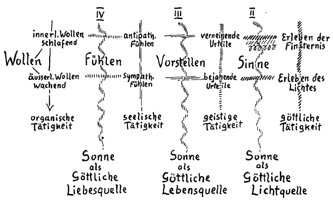 [ 17 ] So this is only a pictorial activity. We can say, precisely in the sense of what we learned yesterday: Here (see diagram on page 166) is our mental activity, but it continues to beat up to the sphere of the senses as wanting, feeling, judging, or imagining. And as this rises up into the sphere of the senses, as the negative judgment rises up into the senses, what does it become? It becomes that which we do not perceive, so—if we represent it to ourselves through the most striking perception, seeing, we can say where we see nothing, where we experience darkness—the experience of darkness. The affirmative judgment, on the other hand, is the experience of light (see diagram). Of course, we could just as well speak of the experience of silence, of the experience of sound or noise. We could express this for all twelve senses in terms of light and darkness.