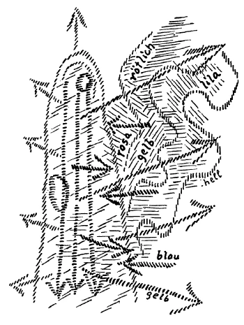 [ 1 ] Yesterday we focused on how the astral body of the human being and the I behave in the state between falling asleep and waking up, and we want to pick up on this again. I said that if we want to compare the human being in the sleeping state as a physical body and etheric body with his ego and his astral body, we must say: The willful ego, the ego that acts according to its will, is shaped by the relationship it enters into with the beings of the spiritual world during sleep. So, if we draw a diagram, we get a representation of the I. And I said: If we consider this grooved representation of the I (see drawing, light) as a kind of negative, as in photography — although we must not take the proportions into account — then the representation of the human physical brain would be like the positive. We would have to think of the astral body as tinged with the soul of the environment, which I express schematically by drawing it in different colors (see page 200, pink, reddish, yellow, purple).