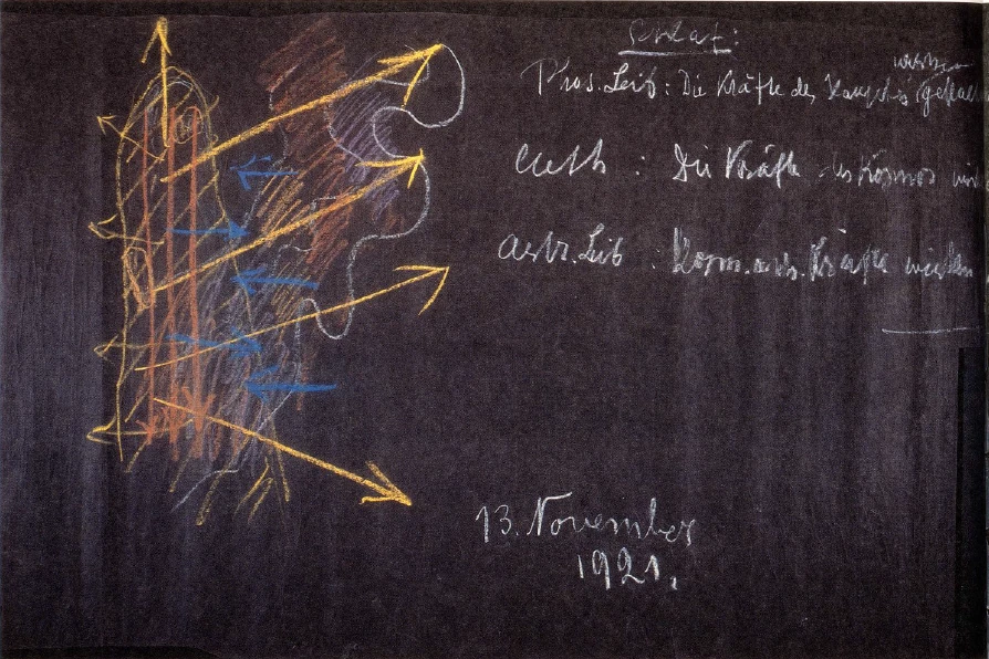 [ 9 ] Let us say, for example, that in the eye we have not only the organization that enables us to see, but at the same time we have in the eye a picture of the cosmos, of the spiritual forces of the cosmos. From the time of death until birth, the human being has lived in the spiritual-soul cosmos. The organization of the eye is modeled on this life in the spiritual-soul cosmos. Like all organs of the head, the eye has a dual function: first, to mediate correspondence with the outside world through seeing. This happens during waking life. During sleep, the eye interacts with its surroundings, namely with its nervous and blood environment, back onto the physical organism, insofar as this is the metabolic-limb organism, and during sleep, for example, the forces of the closed eye act upon the human kidney system and imprint the cosmic image upon it. Other organs of the head imprint other things from the cosmos on the human metabolic-limb system. And so, for the physical body, our sleep time serves above all to allow the forces of the head to have a formative effect on the metabolic-limb human being (see drawing, reddish arrows, and diagram). It is precisely during sleep that, if I want to draw a diagram, formative forces radiate continuously from the head toward the lower human being, so that during sleep the head actually acts as the spiritual-soul formative force for the metabolic-limb human being.