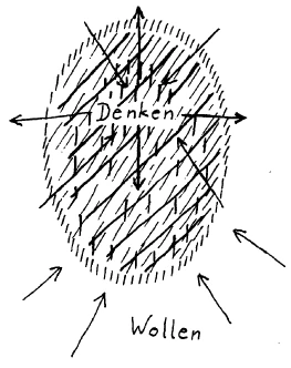 Wollen wir schematisch das Verhältnis des Denkens zum Wollen zeichnen, so müssen wir das in der folgenden Weise tun. Sie sehen, man kann durchaus den Weg machen von der Innenschau des Seelenlebens zu dem physischen Korrelat dieses Seelenlebens, ohne daß man dadurch versucht wird, in einseitiger Weise in den Materialismus zu verfallen. Man lernt erkennen dasjenige, was sich materiell abspielt im Denken und im Wollen. Aber man verliert niemals das Ich, indem man erkennt, wie das Ich innerlich aktiv wird mit dem Unorganischen im Denken, und auf der andern Seite erkennt, wie das Ich in den Geist hineingetrieben wird durch das organische Vitalisieren im Leib. Indem das Ich aus dem Leibe herausgetrieben wird, wird es mit den Kräften des Kosmos zusammengebracht, und von dem geistigen Teil des Kosmos aus, also von außerhalb herein, entfaltet das Ich das Wollen.