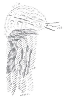 [ 13 ] Graphisch aufgezeichnet, würde das sich so ausnehmen [Hier beginnt die Zeichnung zu Tafel 5]: Nehmen Sie an, das wäre die Konstitution des Gehirnes ( grün), dann ist das so für den Menschen, der geboren ist, daß das Geistig-Seelische (rot) halt davor macht. Das Gehirn ist so konstituiert, daß dieses innere Geistig-Seelische, das der Mensch hat, nicht durch das Gehirn durch kann. Der Mensch ist da drinnen nicht erfüllt von diesem Geistig-Seelischen. Dafür aber können die äußeren Wahrnehmungen herein und können sich durch die Sinne - ich habe hier das Auge gezeichnet - im Gehirn geltend machen. Ich möchte sagen, so geartet ist das Gehirn in der heutigen Konstitution, daß dasjenige, was im Menschen das Ewige ist, nicht herauf kann in das Gehirn. Dadurch aber können die äußeren Eindrücke hinein. Indem der Mensch den Vergessenheitstrunk bekam, erhielt er die Möglichkeit, in das Gehirn dasjenige hineinzubekommen, was geistig-seelisch vor der Konzeption oder vor der Geburt war (rot). Das ist das eine.