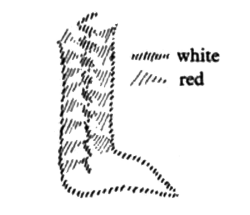 [ 36 ] Wenn wir hier unseren Fuß haben und hier den Knochen, so hat eben gerade das Seelische das Eigentümliche, daß es sich am Knochen bricht (siehe Zeichnung, rot), daß wir unseren Knochen in uns so tragen, daß er leer ist vom Seelischen. Da ist es nicht drinnen; aber es strahlt wiederum in den Organismus zurück.