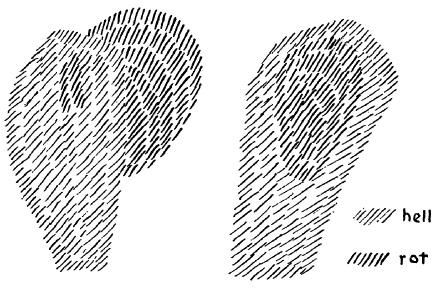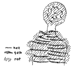 [ 6 ] Ich will das, was ich jetzt eben ausgesprochen habe, einmal schematisch auf die Tafel zeichnen (Zeichnung links). Nehmen wir einfach schematisch den Menschen (hell), und zeichnen wir das, was wir uns vorstellen können als das Schema für die webenden Träume (rot), etwa in der folgenden Weise an den Menschen heran. Man möchte sagen, das, was ich da rot an die Tafel gezeichnet habe, das ist ein Gewebe, das die Seele erlebt, indem es ihr fortwährend entschlüpft, wiederum an sie herankommt.