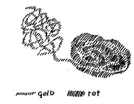 [ 24 ] Was folgt daraus? Daraus folgt, daß das Gehirnwasser, weil das im Inneren abgeschlossen ist, sich fortsetzen kann, eine Art Fortsetzung sein kann dessen, was früher da war. Nicht so innig kann sich aber in dieser selben Art etwa in unserem Atmen irgend etwas fortsetzen von früher. Daher geschieht folgendes: Wenn wir den menschlichen Kopf betrachten und dann den menschlichen Brustorganismus, so finden wir, daß da drinnen im menschlichen Kopf, gewissermaßen sagen wir durch das Gehirnwasser, also im physischen Organismus, richtig die Fortsetzung des vorgeburtlichen geistigen Menschen drinnen ist. Beim Atmungsprozeß ist es nicht so. Da verläuft der physische Atmungsprozeß für sich (siehe Zeichnung, gelb), und das Geistige ist viel weniger stark mit dem physischen Prozeß verbunden (rot). Man möchte sagen: Im Kopf ist der geistige Mensch, der geistig-seelische Mensch mit dem physischen Menschen fest zusammen verbunden; sie sind eine Einheit geworden. Im Brustmenschen ist das nicht so, da sind sie mehr getrennt; da ist der physische Organismus mehr für sich und das Geistig-Seelische auch wiederum für sich.