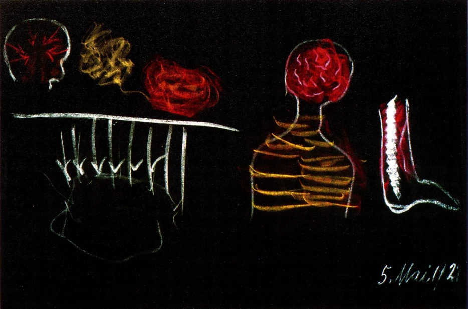 [ 15 ] When we are awake, however, this air process is permeated by the astral body. The movement of the astral body follows the same paths that the air takes in our organism. The air process is only an air process when we are asleep; when we are awake, the movements of this astral body swim, so to speak, in what lives within us as the air process. But now think about this: as the astral body enters into what I have schematically drawn in red and carries out its movements within the air organism, carrying out what it does in general, this takes place in what is schematically drawn in blue, in the watery organism. These air processes, which are actually the processes of the astral body when we are awake, always come into contact with the watery organism.