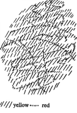 When a baby kicks with its little legs this is not particularly noticeable in the astral body. True, the effects are there but the differentiations which the astral body brought with it are so strong that the following occurs: Let this be the astral body with its wonderful structures (yellow). (This sketch is, of course, merely an indication, but it does illustrate the reality.) These structures gradually disappear; they slip into the physical organs and the astral body becomes ever more cloud-like. But, as I said, when the baby kicks, all kinds of effects are to be seen in the astral body. They