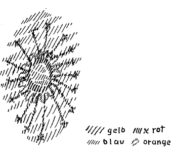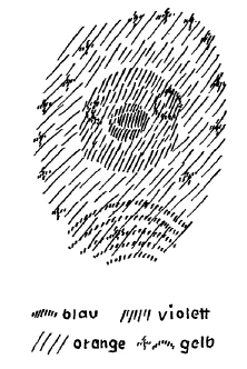 [ 7 ] Damit wir diese Vorstellungen genauer aufnehmen können, wollen wir uns das schematisch auf die Tafel zeichnen. Nehmen wir an, ich wollte das Geistig-Seelische, was da herankommt aus der geistigen Welt, durch diese Figur charakterisieren (Zeichnung S. 114, violett. Die Zeichnung auf Tafel 10 wird während der folgenden Ausführungen nach und nach vervollständigt). Das ist natürlich nur ganz schematisch gemacht. Nur dasjenige, was der Mensch zunächst an sich heranzieht, das wird zu seinem ätherischen Leib. Also er umkleidet sich gewissermaßen, indem er heruntersteigt aus der geistigen Welt, mit seinem ätherischen Leib (orange schraffiert). Aber damit, daß man sagt, «der Mensch umkleidet sich mit seinem ätherischen Leib», ist nicht viel gesagt; man muß da schon ein wenig eingehen auf die Beschaffenheit dieses ätherischen Leibes. Dieser ätherische Leib, der sich da im Menschen heranbildet, ist gewissermaßen eine Welt für sich. Allerdings, man möchte sagen, eine Welt für sich im Bilde. Es ist so, daß dieser ätherische Leib zum Beispiel an seiner Umgebung Sternhaftes zeigt (gelbe Sterne), und daß er in seinem unteren Teile etwas zeigt, was sich mehr oder weniger wie ein Abbild der Erde selber ausnimmt. Ja, er hat sogar eine Art von Abbild des Sonnen- und Mondenhaften in sich.