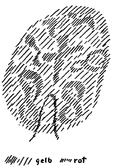 [ 10 ] All this happens slowly and gradually throughout the entire period of life from the change of teeth to sexual maturity. At sexual maturity, these rays have grown together to such an extent that they form a kind of separate structure, an etheric structure (red), within the body. One might say that what were the peripheral stars first radiate inward; then they cease, and these stars become completely pale. Of course, something always remains, but it becomes very pale. These rays also become pale. In contrast, what has gathered in the middle, so to speak, becomes particularly lively. And in what has gathered in the middle, at the time when sexual maturity also occurs, the physical heart hangs within. This is therefore the place in the human organism where the physical heart hangs with the veins (blue).