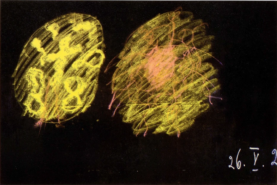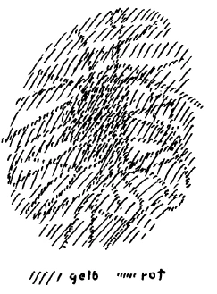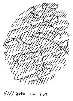 [ 19 ] When you are forty-five years old, almost all movements are recorded in traces in the astral body, and many others as well, as we shall see in a moment. The astral body can absorb much of what has happened since the child learned to speak and think and since it dissolved its own configuration. Thus, the wonderful structure that is the astral body of the child gradually becomes undifferentiated, because all of this gradually disappears into the organs. The astral body becomes an undifferentiated structure, not completely, of course, but relatively undifferentiated. Everything we do with our arms and legs is now recorded in this undifferentiated structure. But what we do with our arms and legs is also recorded: for example, when we guide a pen, everything we have done in the outside world is recorded. When we chop wood, when we slap someone, this is recorded. Even if we do not do something ourselves, but give an order to a servant who then carries it out, this is also recorded through the relationship between the content of our words and what the servant does. In short, the entire activity of a human being that finds expression in the external world is now recorded in this astral body (red in yellow). Thus, the astral body is configured in the most diverse ways by what human activity is. [During the following explanations, the drawing on plate 11, right, is completed. See drawing on p. 122.]