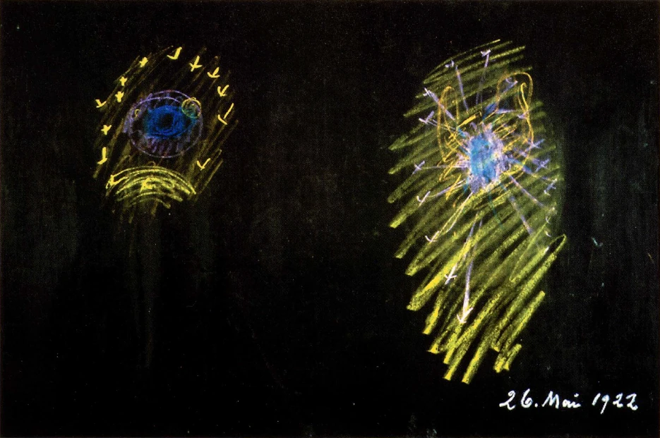 All this takes place gradually throughout the period of life between the change of teeth and puberty. At puberty the process is so far advanced that these rays, having grown together at the center, form, as it were, a distinct structure (red). It could be said that the surrounding stars become very pale and so too the rays, though something is still discernable. By contrast, what has come together into a ball-like formation in the center becomes particularly vivid and alive. Within this structure the physical heart, with its blood vessels, is suspended by the time puberty sets in (blue).