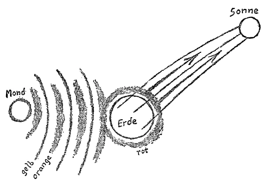 [ 13 ] Der heutige Mensch zeichnet - es ist nur eine schematische Zeichnung, aber sie soll ja auch nur versinnlichen, um was es sich handelt — die Erde und die Sonne - natürlich müßte ich es viel weiter hinauszeichnen — so, daß die Sonne ihre Strahlen zur Erde heruntersendet. Der alte Eingeweihte würde gesagt haben: Das ist ja nur physisch; das Geistige davon ist das, daß auf der Erde die Menschen wohnen, und die Menschen entwickeln auf der Erde ihren Willen (rot), und während die Sonnenstrahlen von der Sonne auf die Erde herunterkommen, kann der Mensch seinen Willen in der Richtung der Sonne in den Weltenraum hinaussenden (Pfeile). Gewissermaßen auf den Wogen des Willens, der von der Erde zur Sonne hinstrahlt, sandten die alten Eingeweihten ihre Fragen in das Weltenall hinaus. Und wenn der moderne Mensch sagt: Auf der anderen Seite ist irgendwie der Mond, der seinen Schein auf die Erde hereinstrahlen läßt (gelb), so sagte der alte Eingeweihte:: Das ist aber nur das Physische; in Wahrheit kommen die Gedanken auf den Wellen dieses Scheins zur Erde herein (orange). Und soübergab der.alte Eingeweihte den Willensstrahlen, die von der Erde zur Sonne gehen, seine Fragen, und empfing von den Gedankenstrahlen, die vom Mond zur Erde kommen, die Antworten. Die heutige Wissenschaft kennt nur die eine Seite der Sache. Die sieht auf das Physische der Sonne und des Mondes. Der alte Eingeweihte aber sagte: Während die Sonne fortwährend ihr Licht zur Erde sendet, sendet die Erde in den Weltenraum die Willensstrahlungen, den Willen von all den Menschen, die auf der Erde leben, fortwährend in die Welt hinaus. Und wenn der Mensch im Scheine des Mondes sich aufhält, dann werden ihm die Gedankenstrahlen aus dem Kosmos geschickt.