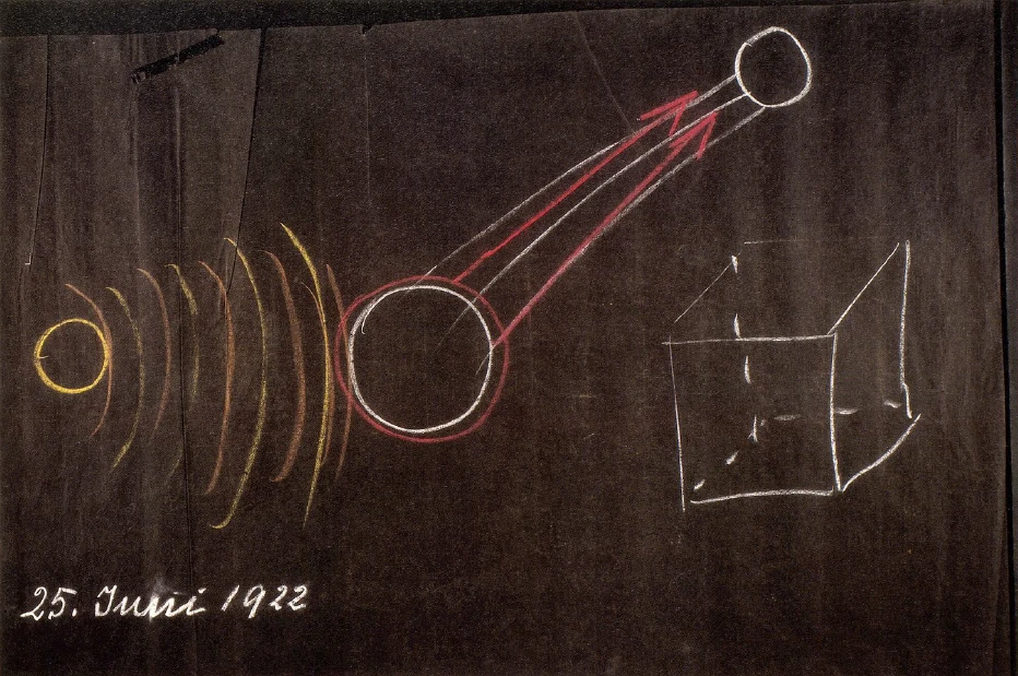 [ 13 ] People today draw — it is only a schematic drawing, but it is only meant to illustrate what it is about — the earth and the sun — of course I would have to draw it much further out — so that the sun sends its rays down to the earth. The ancient initiate would have said: That is only physical; the spiritual aspect of it is that human beings live on the Earth, and human beings develop their will (red) on the Earth, and while the sun's rays come down from the sun to the Earth, human beings can send their will out into the world space in the direction of the sun (arrows). In a sense, the ancient initiates sent their questions out into the universe on the waves of the will that radiated from the earth toward the sun. And when modern man says, “On the other side is somehow the moon, which shines its light onto the earth (yellow),” the ancient initiate would say, "But that is only the physical aspect; in truth, thoughts come to Earth on the waves of this light (orange). And so the ancient initiate sent his questions to the rays of will that go from the Earth to the Sun, and received the answers from the rays of thought that come from the Moon to the Earth. Today's science knows only one side of the matter. It looks at the physical aspect of the Sun and the Moon. But the old initiate said: While the sun continuously sends its light to the earth, the earth continuously sends the rays of will, the will of all the people living on earth, out into the world. And when man dwells in the light of the moon, the rays of thought are sent to him from the cosmos.