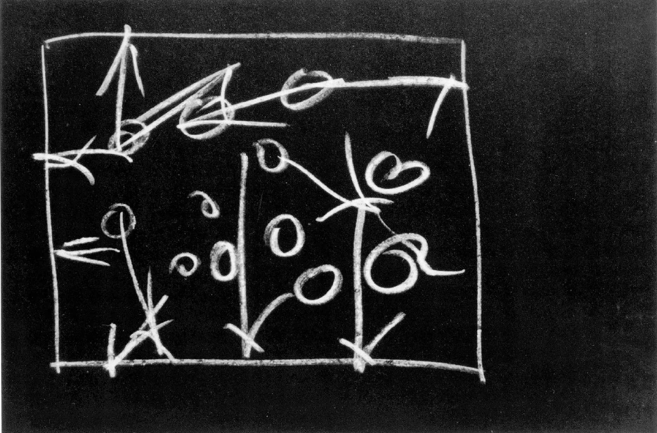 Nun möchte ich Ihnen vergegenwärtigen, was ein Hörer im Hörsaal der Physiologie bei Adolf Fick hören konnte, ein Hörer, der vielleicht eben bei Franz Brentano Philosophie gehört hatte, aus einem solchen Geiste heraus, wie ich es Ihnen eben charakterisiert habe. Da wurde etwa folgende Anschauung vorgetragen. Ich zitiere nur, denn was ich Ihnen jetzt sage, ist ungefähr wörtlich enthalten in den Vorlesungen, die dazumal Adolf Fick an der Universität in Würzburg gehalten hat. Er sagte, was etwa in die folgenden Sätze zusammengefaßt werden könnte: Wir betrachten zum Beispiel die Wärme, die wir zunächst durch unsere Empfindung wahrnehmen. Wenn wir einen Körper berühren, so kommt er uns warm oder kalt vor, wir haben Wärmeempfindungen. Was aber diesen Wärmeempfindungen in der Außenwelt entspricht, das ist eine Bewegung der kleinsten Teile der Körper, das ist eine Bewegung, die in den Atomen und Molekülen oder auch von den Atomen und Molekülen im Raum ausgeführt wird. Wenn wir zum Beispiel ein Gas betrachten, so muß dieses Gas ja in einem allseitig geschlossenen Raum abgeschlossen sein; darinnen aber sind dann die Atome und Moleküle des einzelnen Gases vorhanden. Die sind aber nicht in ruhigem Zustand, sondern die schwimmen hin und her, stoßen sich gegenseitig, stoßen an die Wände. Da ist alles darinnen Bewegung und Aufruhr (s. Zeichnung). Und wenn wir mit unserer Hautfläche dasjenige berühren, was dadrinnen aber nur eine Bewegung ist, so haben wir die Empfindung der Wärme.