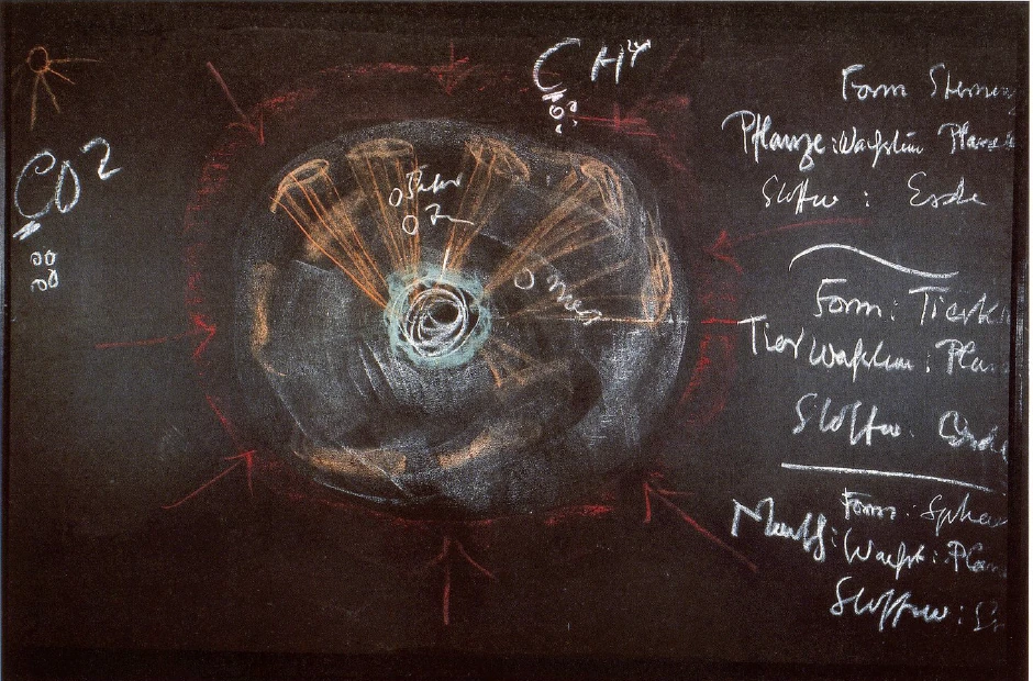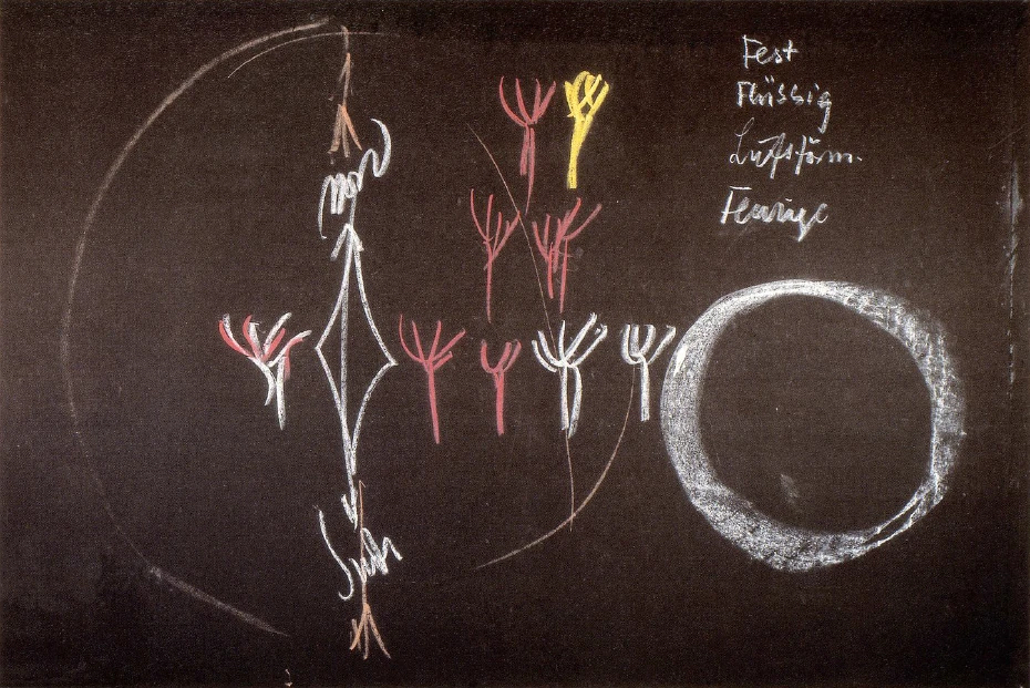 And so you see what is on earth as plant cover (green), as if it were really painted by the starry sky. It is actually the case that the form of the plant body is determined, created, by the cosmos. And now you can easily understand: if you look further in, if you see the fixed stars out there, then closer to the earth you see the planets Saturn, Jupiter, Mars and so on. They are moving. The fixed stars show you the constellations at rest, which give the plants their shape. But the moving planets send down forces of movement. It is these that the plants first draw out of the root, then make them grow higher and higher, and so on. Just as the shape of the plants is formed from the fixed starry sky, so the movement is formed from the movement of the celestial bodies closer to the earth. Only what takes place in the plant itself, this metabolism, that, for example, the plant absorbs carbonic acid, assimilates it, as they say, and secretes the carbon, so that it forms its carbon body, that is from the forces of the earth itself. We can therefore say: When we look at the plant in its entirety, its form is from the starry sky, its growth is from the planetary movement, and its metabolism is from the earth.