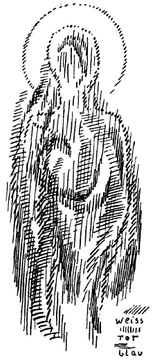 [ 12 ] Der Atemstoß, der vom Kopfe nach dem Körper geht, will sich zur Mumie formen (siehe Zeichnung S. 92). Und nur dadurch, daß der Körper entgegenwirkt und wiederum die Ausatmung bewirkt, wird diese Mumie zurückverwandelt. Was man da vom menschlichen Haupte gegen den übrigen menschlichen Organismus zu sich bilden sieht, indem der Atem vorstößt, diese schnell wie eine Mumie sich bildende Gestalt, die sich aber sogleich wiederum auflöst, indem der Atem ausgeatmet wird (weiß), das bleibt nur zurück in einem fast fortwährend, namentlich während des Wachens, bleibenden Schein des ätherischen Leibes (rot). Wenn man den ätherischen Leib betrachtet, bekommt man das Gefühl: vom Kopf aus will er sich fortwährend zur Mumie formen und wiederum auflösen in eine Art von Ähnlichkeit mit dem menschlichen physischen Organismus (blau). Das ist die innere bewegliche Plastik, diese Tendenz des menschlichen ätherischen Leibes, die Mumiengestalt anzunehmen und wiederum zurückzukehren, so daß er wieder ähnlich wird dem menschlichen physischen Organismus.