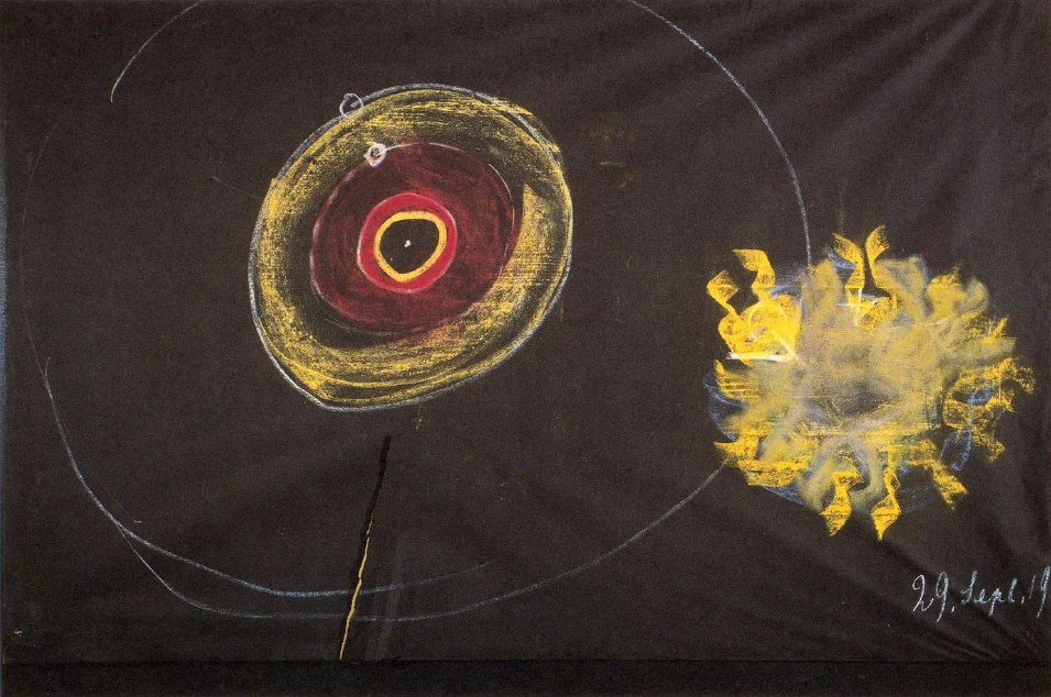 [ 4 ] Gehen wir jetzt zu dem nächsten Planeten, der mit der Erde um die Sonne kreist, so können wir uns schematisch — es ist natürlich hier ungenau — diesen Planeten, die Venus, in ihrer Bahn vorstellen und können das, was in dem Raum auf eine luftförmige, ätherische, feinere Art eingeschlossen ist, wiederum in dieser Weise bezeichnen (gelb), und wir müßten, wenn wir die nächste Schicht der Erde zeichnen, diese Schicht wieder als eine Spiegelung dessen zeichnen, was da draußen ist (gelb). Und so würden wir die ganze Erde bekommen als ein Spiegelbild des Universums, nur daß wir immer das, was draußen in ätherischer Verdünnung, in ätherischer Flüchtigkeit ist, zusammengedrückt, verdichtet finden würden, wenn wir in die Erde hineingraben. Und wenn wir dann zu dem äußersten Umkreis des Weltenalls kämen, so würde dieser äußerste Umkreis des Weltenalls im Mittelpunkte der Erde ganz verdichtet in einem einzigen Punkte sein.