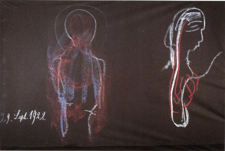 [ 12 ] The breath that goes from the head to the body wants to form itself into a mummy (see drawing on p. 92). And only because the body counteracts this and causes exhalation does this mummy transform back. What we see forming from the human head toward the rest of the human organism as the breath pushes forward, this shape that quickly forms like a mummy but immediately dissolves again as the breath is exhaled (white), remains only in an almost continuous, especially during waking, appearance of the etheric body (red). When one observes the etheric body, one gets the feeling that it wants to continually form itself into a mummy from the head and then dissolve again into a kind of resemblance to the human physical organism (blue). This is the inner, mobile plasticity, this tendency of the human etheric body to take on the mummy form and then return, so that it becomes similar again to the human physical organism.