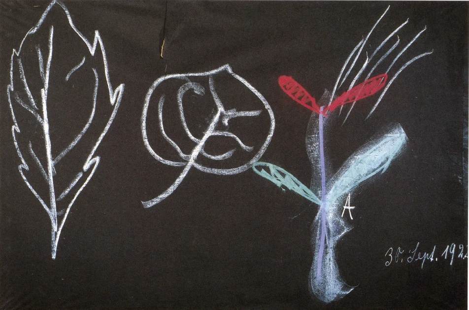 [ 10 ] And when I have a plant (see drawing), Goethe said to himself: Down there is the green leaf, up there is the flower petal (red) – the intellectual philistine says: There are two, there are two leaves. What could be more obvious to the intellectual philistine than that these are two leaves, since one is red and the other green? But if a person has a green skirt and a red jacket, these are indeed two, because when it comes to clothing, at least in modern times, philistine thinking prevails; there, philistine thinking is appropriate. But the plant does not participate in this philistinism, Goethe said to himself, the red leaf is the same as the green leaf. There are not two leaves at all, there is actually only one leaf in different forms; in one case, the same force acts down there at point A. There it acts in such a way that the forces are mainly drawn out of the earth. The plant draws the forces out of the earth, sucks them up, and the leaf has to grow under the influence of the earth's forces and turns green. And as the plant continues to grow (violet), the sun comes and shines on it more and more strongly than down below. The sun prevails, the same impulse grows into the sun and turns red.