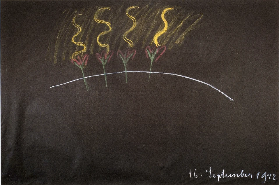 It is the case that one comes out into the cosmos in such a way that, initially, the plant world of the earth is the mediator. Don't misunderstand me: I'm not saying that the plants covering the ground at the place where one died are the ones that prepare the way out, but when we look at the plant world of the earth, it presents itself to the spiritual vision in such a way that what the physical eyes see is only a part of that plant world. I will draw what is taking place in a schematic way on the board (see drawing). Let us assume that this is the surface of the earth; plants grow out of the earth's surface (green). It is, of course, drawn out of all proportion, but you will understand what I mean. One follows these plants with the senses to the flowers (red). The spiritual view of these plants, however, shows that this is only part of the plant world, that from the flowers upwards an astral event and weaving begins. In a sense, an astral substance is poured out over the earth, and spiral formations (yellow) arise from this astral substance. Wherever the earth provides the opportunity for plants to arise, the flowing over of these astral world spirals gives rise to plant life.