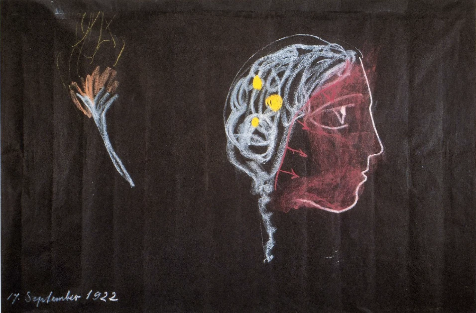 Ich möchte Ihnen das skizzenhaft darstellen. Wenn wir das menschliche Haupt eines normal funktionierenden Menschen betrachten, so zeigt sich der geistigen Anschauung das Folgende: Während wir wachen, während durch das Wachen fortwährend die Eindrücke der Außenwelt an das menschliche Haupt herantreten, spielt sich für das Bewußtsein alles das ab, was in der Sinnesanschauung lebt. Ich möchte das, was in der Sinnesanschauung lebt, hier dadurch charakterisieren, daß ich zunächst das Auge zeichne (siehe Zeichnung), die Nase, wo sich die Geruchsempfindungen, Gaumen, Mund, wo sich die Geschmackserlebnisse abspielen. Dieser rot angestrichene Teil soll also schematisch alles das darstellen, was der Mensch eigentlich im gewöhnlichen Bewußtsein erlebt. Aber in der Tatsachenwelt, die im Menschen vorgeht, spielt sich nicht nur das ab. Sie wissen ja, daß das Gehirn in der mannigfaltigsten Weise gegliedert ist. Ich will das nur schematisch andeuten (blau-grün). Was hier im Gehirn so kombiniert, gegliedert ist, das ist eben ein Abbild des ganzen Universums, das ist das ganze Universum ins Kleine zusammengezogen und mit Stoffen der Erde ausgekleidet. Dadurch, daß dieses Gehirn in seinem IchTeil, seinem astralischen und ätherischen Teil dann mit physischem Erdenstoff ausgekleidet ist, hat die Erde mit ihren Kräften, mit ihren Bestandteilen eben Einfluß auf diesen Teil des Menschen.