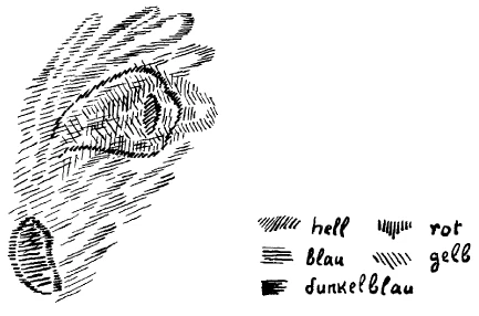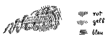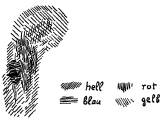 [ 5 ] Aber dieses Wäßrige, das da vom Nierensystem gewissermaßen ausstrahlt in den ganzen Organismus und auch bis ins Auge hineinstrahlt, das ist durchaus nicht ein totes Wäßriges, sondern das ist ein lebendes Wäßriges. Sie würden eine ganz falsche Vorstellung bekommen von dem, was im Menschen das Flüssige, das Wäßrige ist, wenn Sie sich innerhalb des lebendigen menschlichen Organismus vorstellen wollten (siehe Zeichnung, blau), daß man es da mit Wasser zu tun hat, so wie es im Bach fließt. Das ist nicht der Fall. Im Bach haben wir totes Wasser, im menschlichen Organismus haben wir lebendes Flüssiges. Es ist nicht nur die Plasmaflüssigkeit lebendig, es ist alles Flüssige im menschlichen Organismus lebendig. Und in diesem Flüssigen sind fein aufgelöst auch überall diese Ihnen früher schon genannten festen Bestandteile, die gewissermaßen auf den Wogen des Flüssigen fortgetragen werden, auch bis in die Augen hinein. Wiederum auf den Wogen der inneren Flüssigkeit strahlt der ätherische Organismus des Menschen in die Augen hinein. Im Auge begegnet sich jetzt zweierlei. Der ätherische Organismus des Menschen (blau) füllt das Auge aus, vom Auge den Sehnerv; und was jetzt in diese vom ätherischen Organismus ausgefüllte Flüssigkeit hineinströmt, das ist das astralische Bild, das im menschlichen astralischen Leibe entsteht (rot). Und dies hier (gelb) ist das, was durch das Ich entsteht. Das strömt da hinein; es strömt da auch weiter.