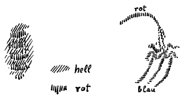 [ 21 ] Nehmen Sie das Auge. Im Auge breitet sich der Sehnerv einerseits aus, auf der anderen Seite aber Blutgefäße (siehe Zeichnung, rot). Dadurch, daß sich Blutgefäße ausbreiten, haben Sie den StoffwechselGliedmaßenorganismus im Auge. Dadurch, daß sich der Sehnerv ausbreitet, haben Sie den Sinnes-Nervenorganismus im Auge. Jetzt schauen Sie ins Auge hinein. Da besteht nämlich ein Verhältnis von eins zu vier im Auge zwischen den Vorgängen im Sehnerv, in der Netzhaut, und dem Blutschlagtempo. Im Auge vibriert fortwährend etwas ineinander, dessen Rhythmen sich verhalten wie eins zu vier. Und auf diesem Ineinandervibrieren zweier verschiedener Rhythmen beruhen