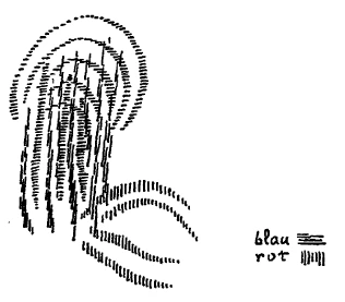 [ 23 ] Ich will das noch einmal an einem Beispiel klarlegen. Nehmen wir einmal an, der heutige Arzt diagnostiziert meinetwillen Herzerweiterung. Er macht das in der Weise, wie man das heute macht, und er findet die Herzerweiterung. Man kann nicht viel anfangen mit einer solchen Diagnose. Man hat vielleicht probiert, ob dieses oder jenes da helfend wirken kann, aber man weiß ja keinen Zusammenhang. Man weiß keinen Zusammenhang, weil man die ganze Sache nicht durchschaut. Ein richtiges Durchschauen aber wird folgendes ergeben. Nehmen Sie einmal an, daß, wie ich Ihnen öfter auseinandergesetzt habe, der Mensch doch eigentlich seinen Organismus immer nach sieben Jahren erneuert. Ich habe Ihnen aber auch das letzte Mal gesagt, wie diese Erneuerung geschieht. Da werden immerfort vom Nierensystem aus die unverarbeiteten Stoffe gewissermaßen nach aufwärts oder auch nach vorne oder nach unten geschickt. Vom Kopfsystem aus wird die Abrundung vollzogen (siehe Zeichnung), so daß fortwährend vom Kopfsystem aus solche Wellen gehen (blau), welche die Form bewirken, und vom Nierensystem aus solche Wirkungen stattfinden, die durch die Wellen abgebrochen und geformt werden (rot), viermal schneller, habe ich gesagt.