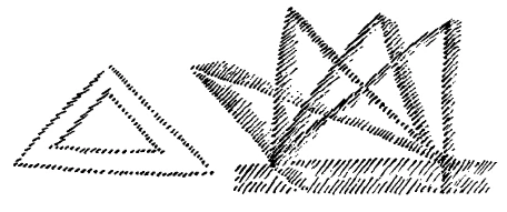 [ 27 ] Das steht vor uns: es muß alles in bewegliches Erkennen übergehen. Vor allen Dingen müssen wir eigentlich schon in der Schule anfangen mit der Beweglichkeit. Es ist etwas Fürchterliches, wenn wir die Kinder im Unbeweglichen halten in der Schule. Es ist zum Beispiel mir immer schon etwas Schweres, daß die Kinder, sagen wir, irgendein fertiges Dreieck haben, mit dem sie alle möglichen Sachen machen. Dieses Stillstehende ist eigentlich nichts. Man müßte im Grunde genommen so etwas haben, wo das Dreieck verschiebbar ist. Darauf kommt es an, daß das Kind richtig die Vorstellung bekommt, daß das alles nur in Bewegung erfaßt werden soll (siehe Zeichnung).