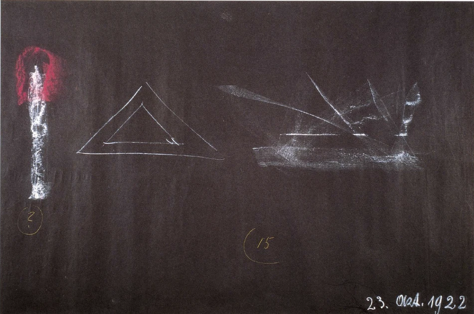 [ 27 ] That is what lies ahead of us: everything must be transformed into mobile cognition. Above all, we must actually begin with mobility at school. It is a terrible thing to keep children immobile at school. For example, it is always difficult for me that the children have, let's say, a ready-made triangle with which they do all kinds of things. This immobility is actually nothing. Basically, you should have something like this where the triangle can be moved. The important thing is that the child really gets the idea that all this should only be grasped in motion (see drawing).
