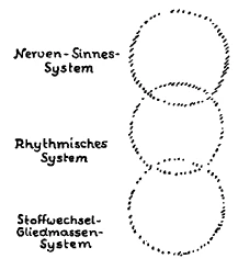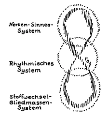 Now we can schematically represent the human being in the following way, if we take into account his tripartite nature. We thus have the nervous-sensory organization, the rhythmic organization and the limb-metabolic organization.