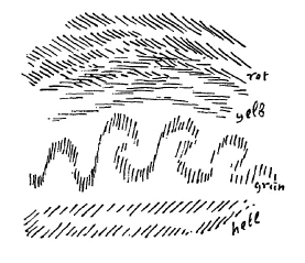 If I wanted to draw this schematically for you, I would have to do it in the following way. This would be the diagram of the sleeping human being (light, green, yellow, red). The lower light-green line is the physical body lying in bed and the etheric body, which appears to the spiritual-scientific view like soil, mineral matter, out of which sprouts plant life, naturally in a different form, but recognizable to the spiritual-scientific view. Above it, glowing like a flame that cannot approach, are the ego and the astral body, represented in the red-yellow line above it. Thus, if you look at the human being in sleep, you have, as it were, a sprouting, sprouting piece of earth in the bed and a separate, glowing astral ego belonging to it.
